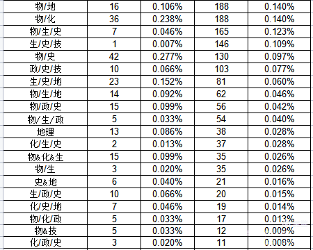 1、“物理+化学+X”组合专业覆盖率皆为96%之上,其他组合则断崖式下跌至40%-53%。“3+3”模式中的部分热门组合在新情况中,选科优势尽无。如物理+地理+技术、物理+生物+政治、化学+生物+政治等。