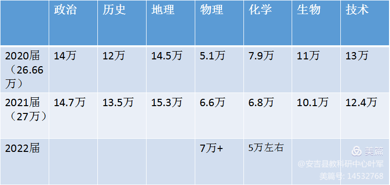 化学学科:近几年,选考化学学科人数在各层次学校都在锐减,呈倒锥型:优秀学生多,县域一级重高普通班学生都很少选,估计2022年高考就要启动保障赋分机制了。2021级把化学和物理捆绑在一起,必然会使选考化学人数反弹,尤其是县域一级重高学校。普通学校或者薄弱学校学生选考化学,赋分依然是不划算的。估计全省选考化学总的人数,也很难恢复到老高考文理分科时的理科人数。